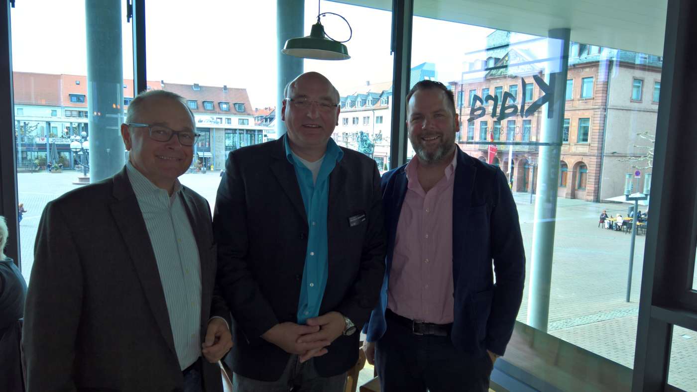 Am 2. Mai trafen sich Norbert Schalinsky, Leiter der Geschäftsstelle des Saturn am Kurt-Plaum-Platz und Vorsitzender des Hanauer Marketing Vereins, Henrik Statz, Vorsitzender des Stadtverbands der Freien Demokraten FDP in Hanau und Dr. Michael Weller, stellvertretender Vorsitzender, im Café Klara.